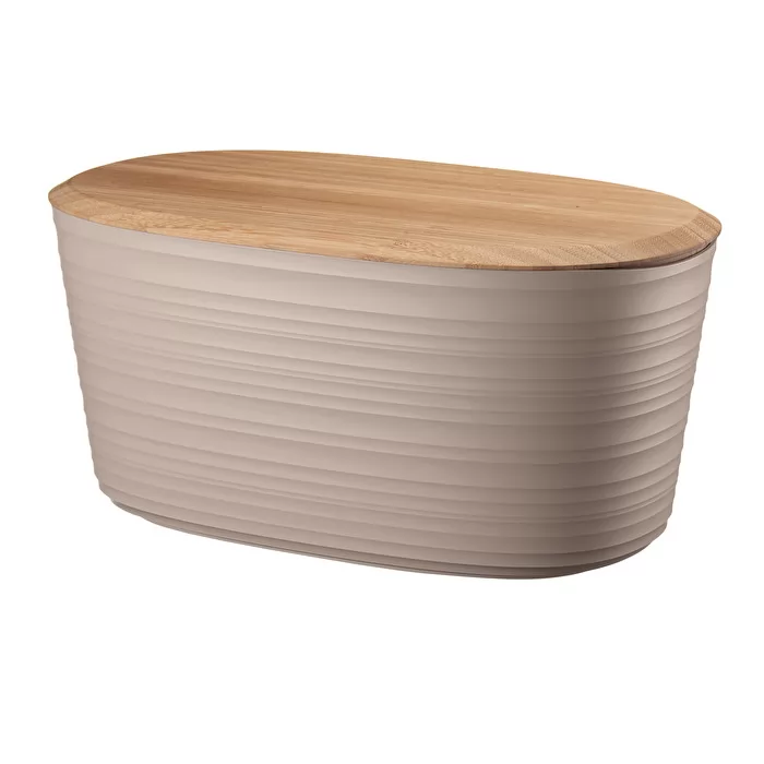 0Bread bin from Guzzini’s Tierra range, made by recycling twenty-seven 100% post-consumer disposable water bottles. With bamboo wood top. Particularly versatile, it is also an excellent kitchen organizer. The bamboo lid also doubles as a handy bread board.