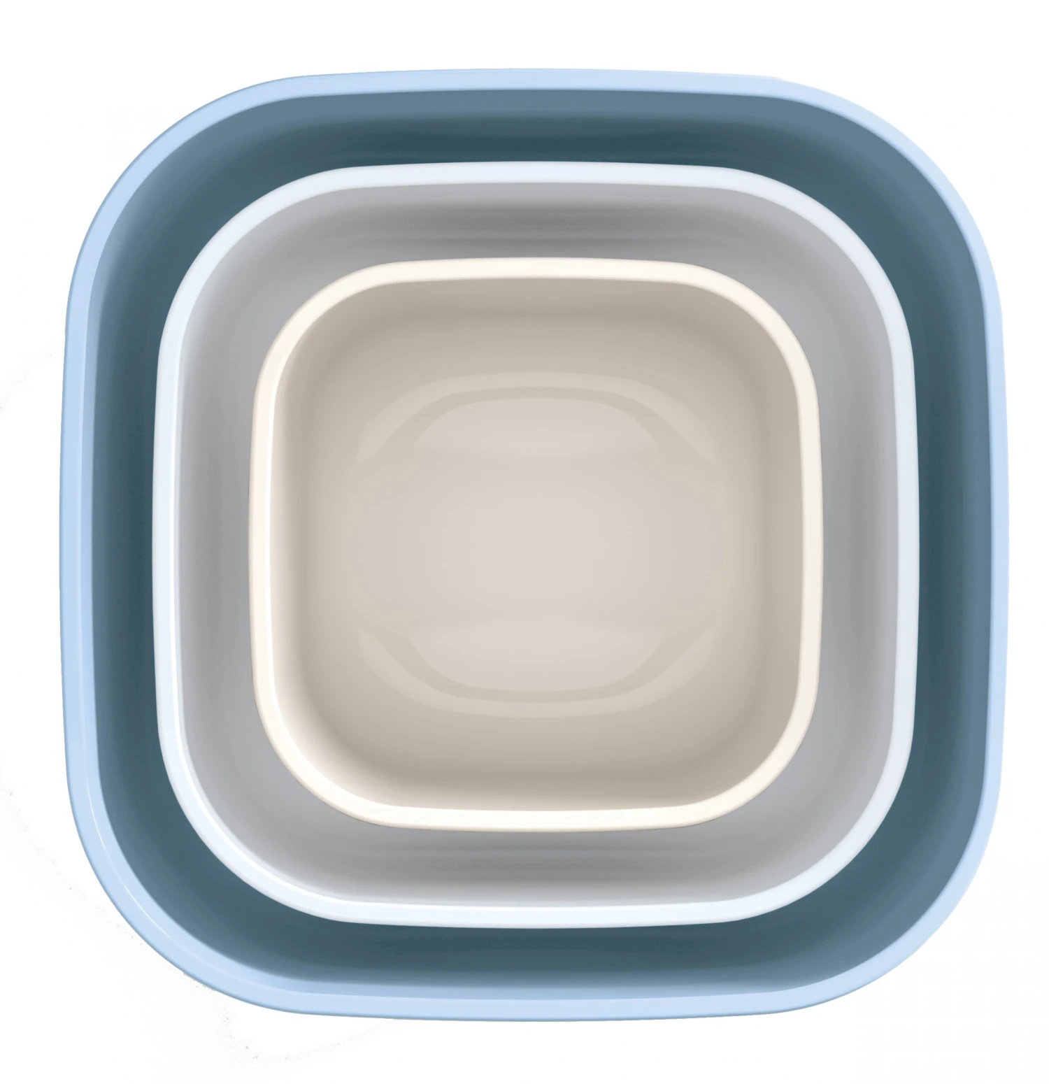 Containers come in either shallow or deep options in 3 sizes. The 3 sizes of shallow containers will stack neatly one within another. The 3 sizes of deep containers will stack neatly one within another.