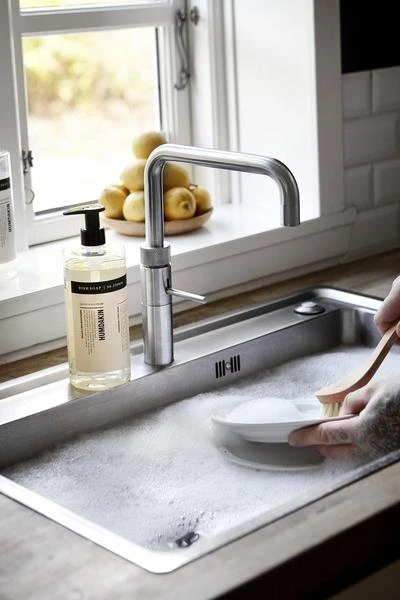 Dish brush by HUMDAKIN in dark oak wood with 100% plant-based tampico bristles. Tampico comes from the Agave lechuguilla plant. The very durable bristles are stiff and retain their shape well. This brush is perfect for daily cleaning with the HUMDAKIN dish soap as well as a more abrasive, thorough dish cleaning after a pot or pan has been soaking in water. Oak is heavy, hard-wearing and highly durable. The wood is a dark grey-brown with a clearly visible grain pattern, making it a very beautiful wood species. Tip: Tip: Have an organizing bucket or other holder by your sink so you can stylishly organize your dish brush and dish soap. Always let the brushes dry with the bristles facing upwards. Materials Shaft: 100% Oak wood Bristles: 100% plant-based Tampico Size: 23cm x 4cm